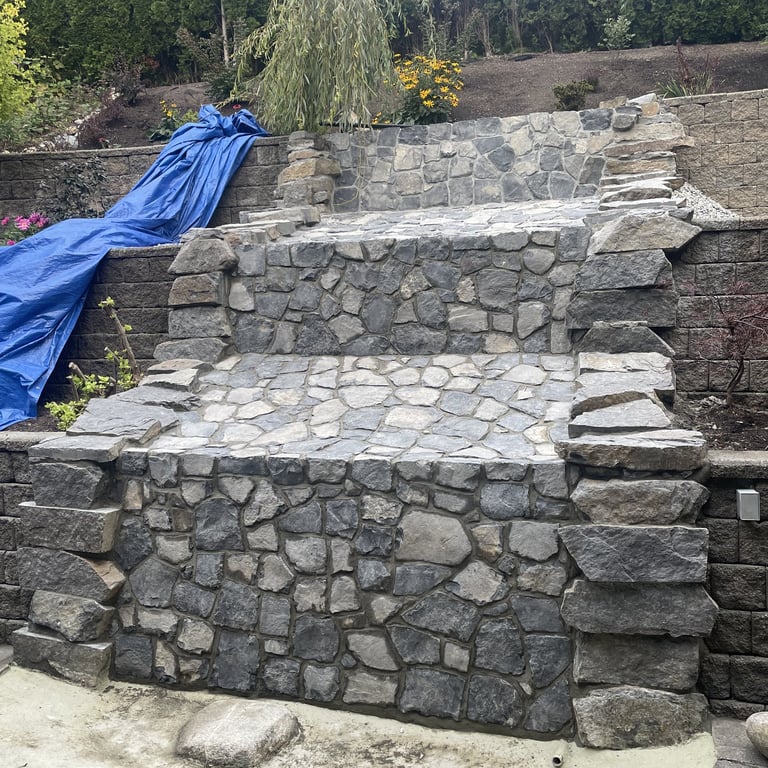 We excavated all of the old stone and identified the damage. We poured new concrete pads and installed a specific waterproof membrane. Local supplier helped us to source some nice stone to match existing boulders.
